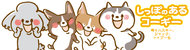 しっぽのあるウェルシュ・コーギー・カーディガンのおこげを中心に、時々シベリアンハスキー、ジャックラッセルテリア、トイプードルの四コママンガ。