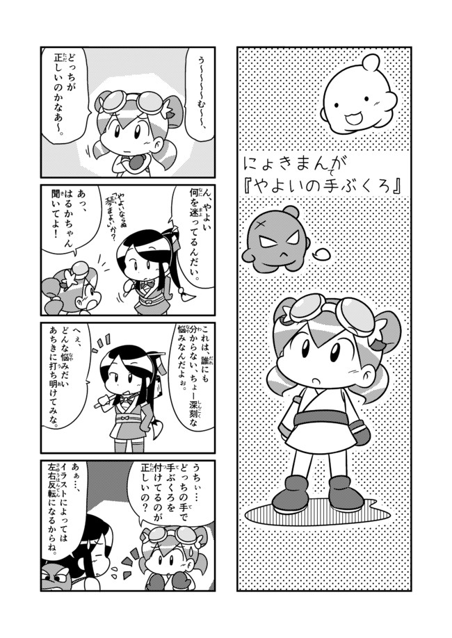 小さな善霊の女の子、琴やよい。 どっちの手で手ぶくろを付けて…