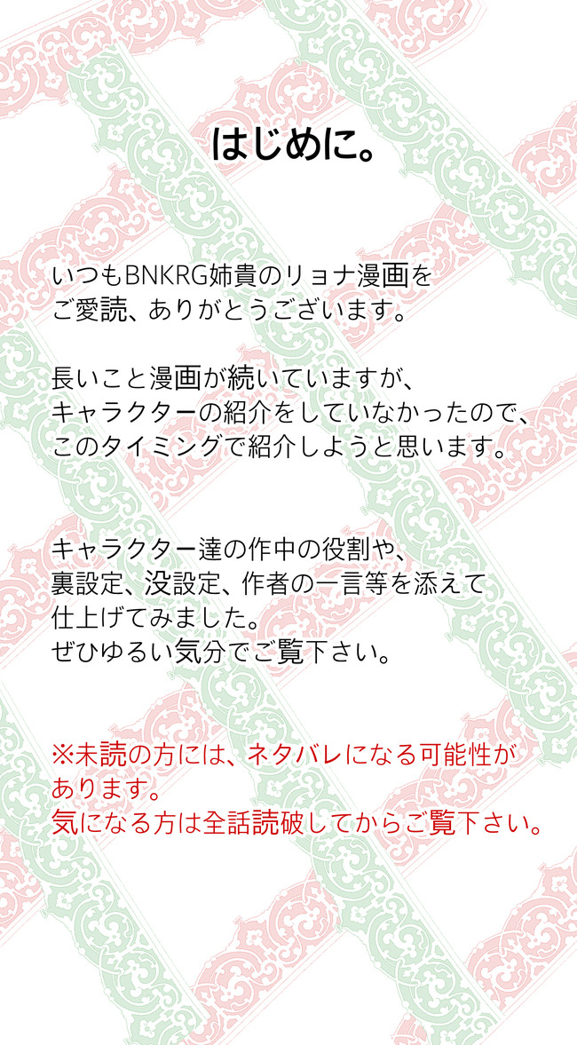 今更のキャラクター紹介です。 鼻くそでもほじりながらご覧くだ…