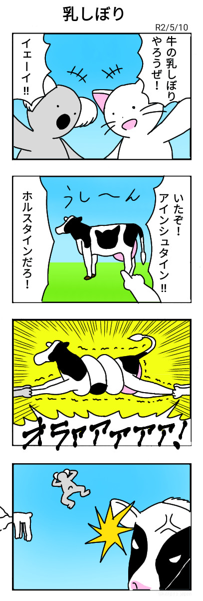 牛の乳しぼりをしたくなったムサシと小森は牛のもとへ向かう。